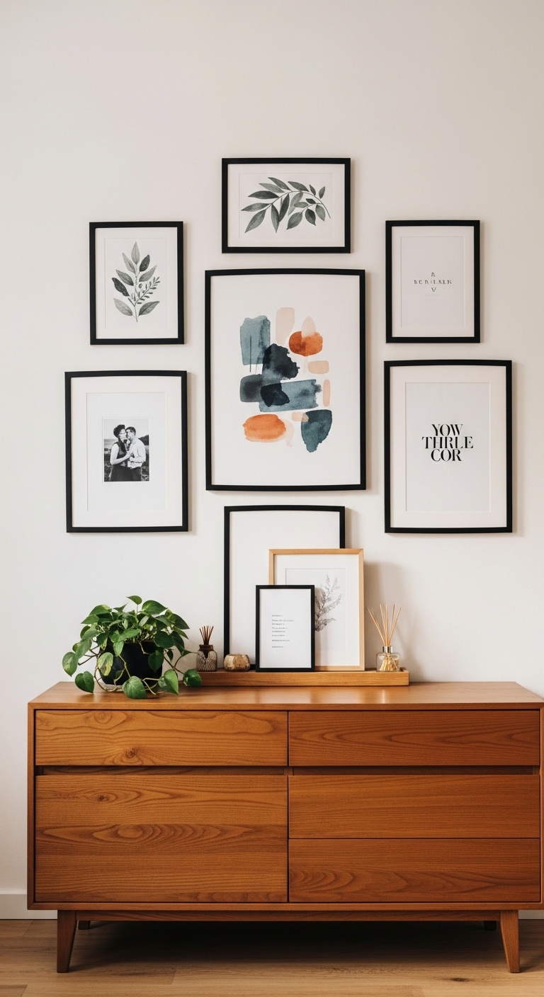 - Leave consistent spacing between frames — 2–3 inches is the sweet spot