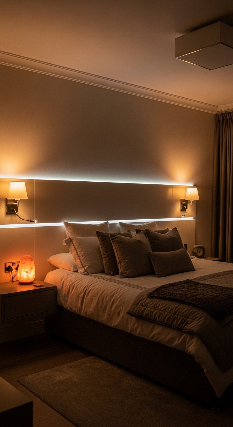 - Accent light: LED strip lights behind a floating headboard panel, or a warm Edison bulb lamp on a dresser