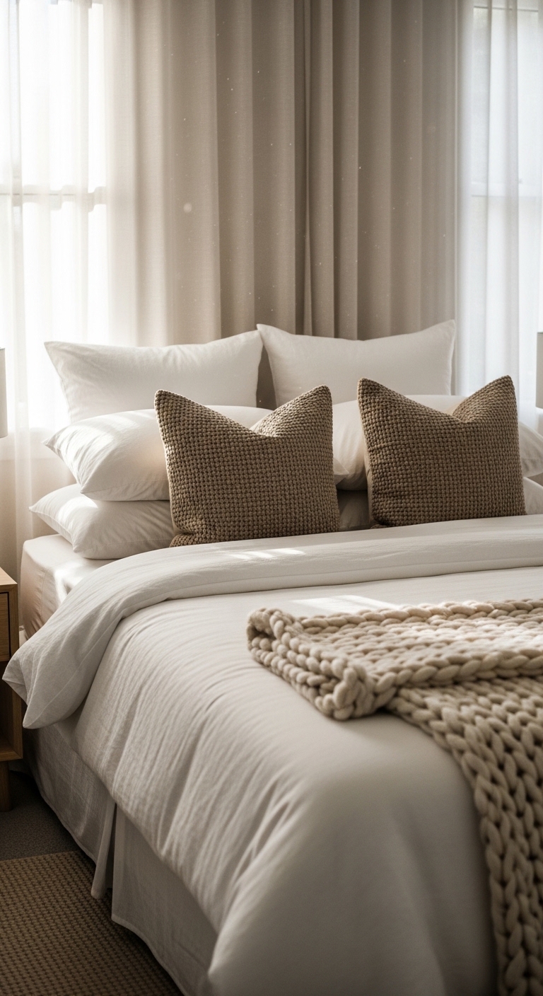 - Layer in two or three neutrals — warm white, natural linen, and muted oatmeal work beautifully