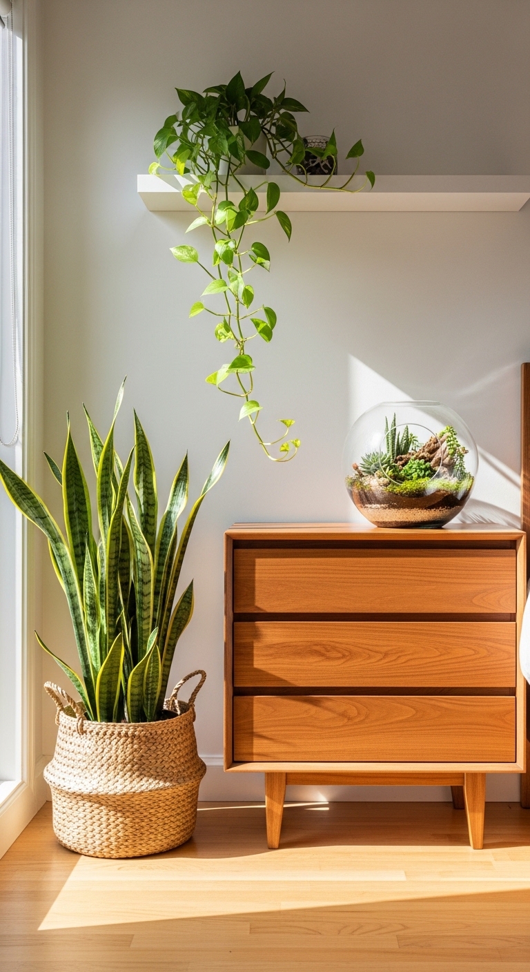 Styling tip — don’t just stick one small plant on a windowsill and call it done. Create a plant moment. A tall snake plant in a woven rattan planter in the corner, a trailing pothos on a floating shelf above the dresser, and a small succulent on the nightstand creates a cohesive, layered botanical feel.