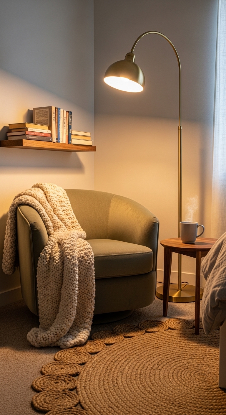 A reading nook or cozy corner doesn’t require a large space. Even a 4×4 foot area is enough to create something genuinely special. The goal is to build a spot that feels intentional, comfortable, and separate from the sleep zone — a little retreat within your retreat.