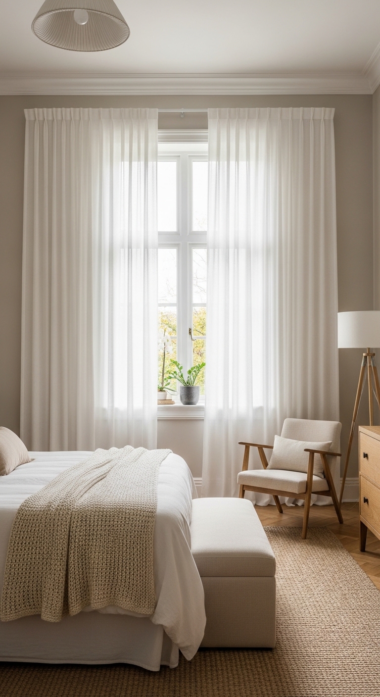 - Avoid short curtains at all costs — they’re one of the most common bedroom decor mistakes