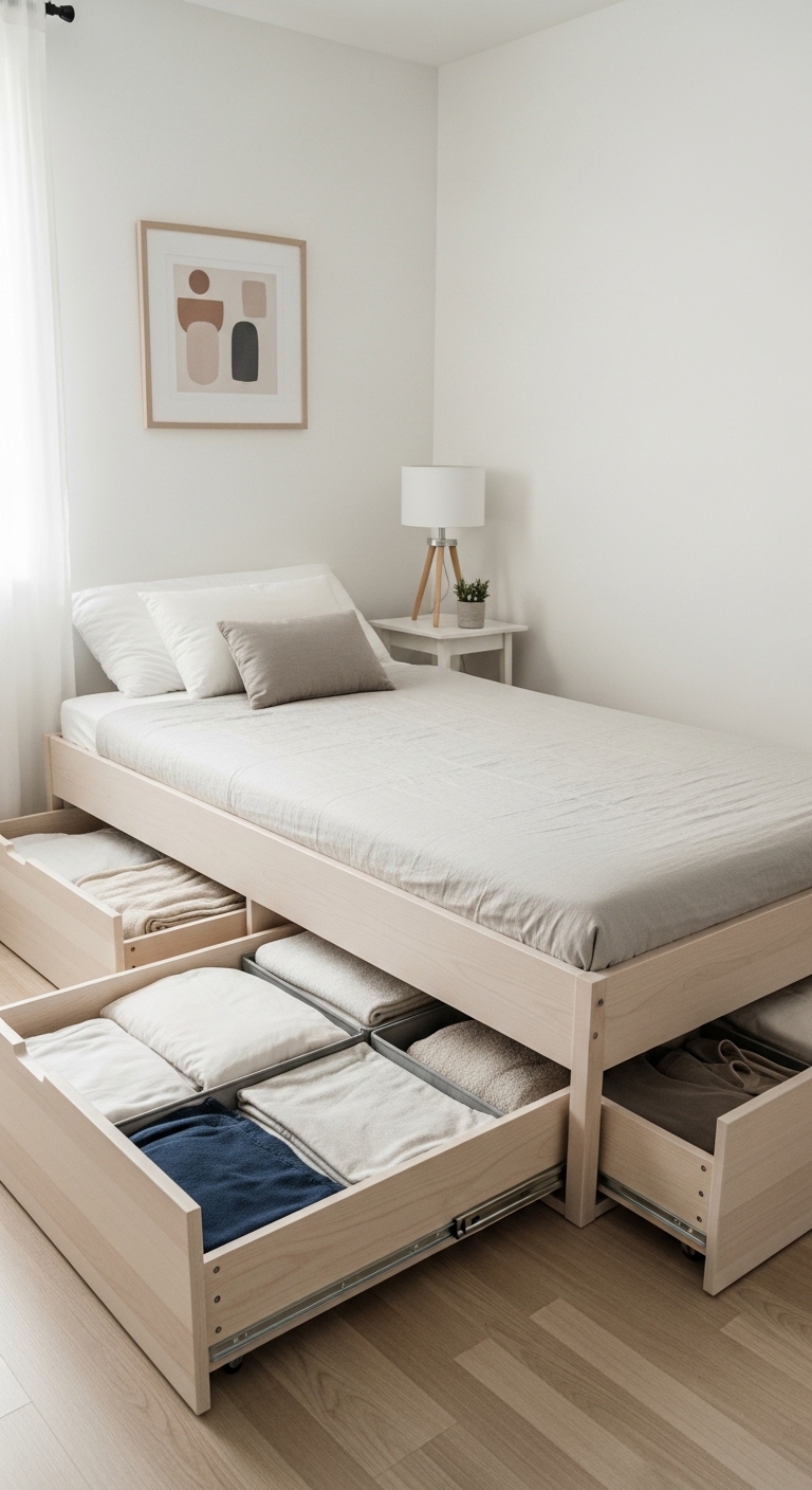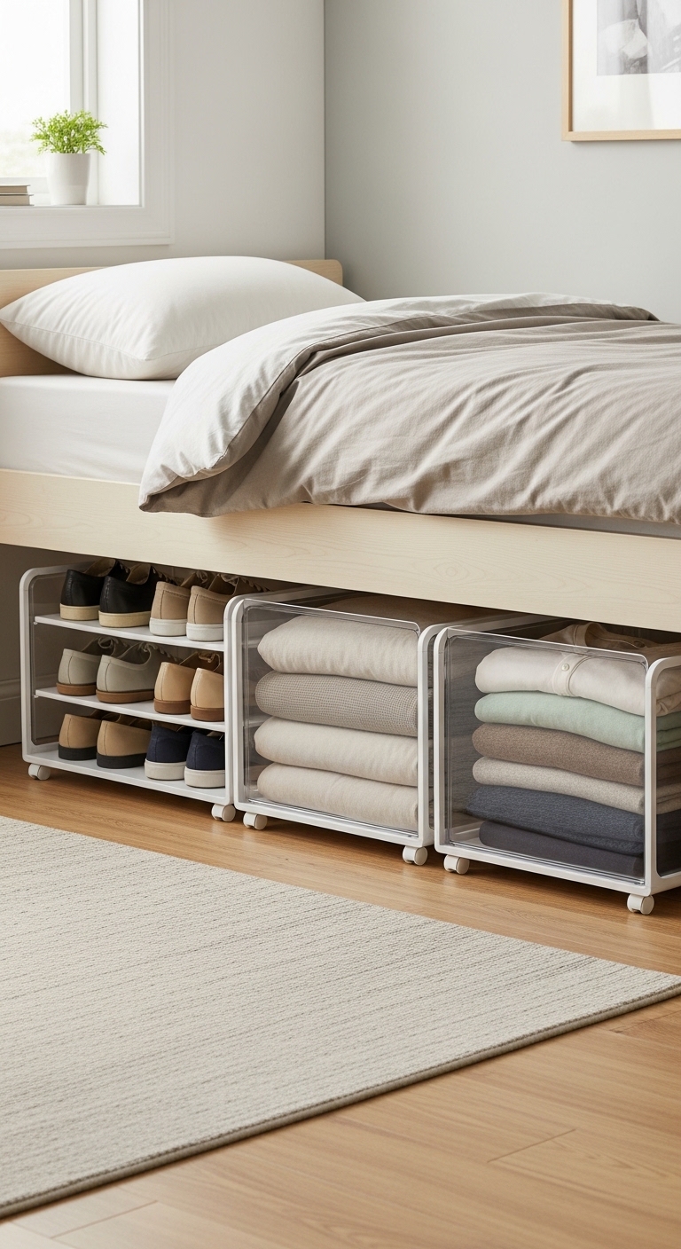 Flat rolling bins, vacuum storage bags, and purpose-built under-bed containers can hold an impressive amount — seasonal clothing, extra blankets, shoes, even books. The key is keeping it organized so accessing it doesn’t become a headache.