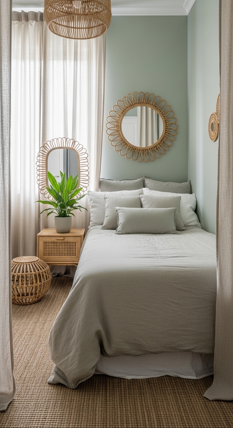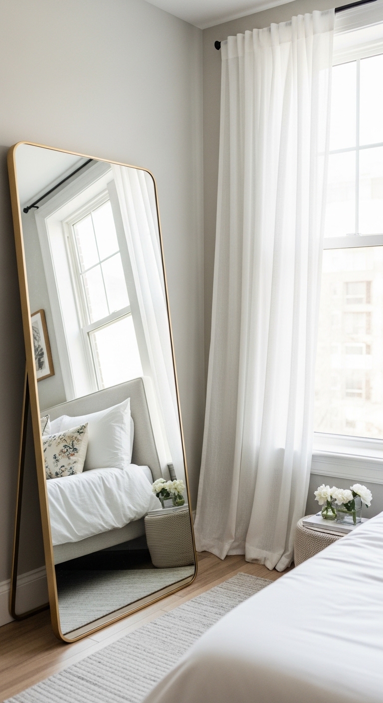 Mirrors are the oldest trick in the small-space playbook — and they still work like magic. A large mirror reflects light and visually doubles the depth of a room. Place one across from a window and watch how your bedroom suddenly feels twice as bright and twice as big.