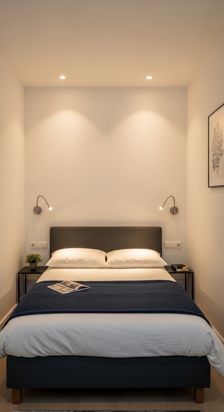 Table lamps are lovely — but in a small bedroom, they take up precious nightstand real estate and add visual clutter. Wall-mounted sconces or recessed ceiling lights give you all the function with none of the footprint.