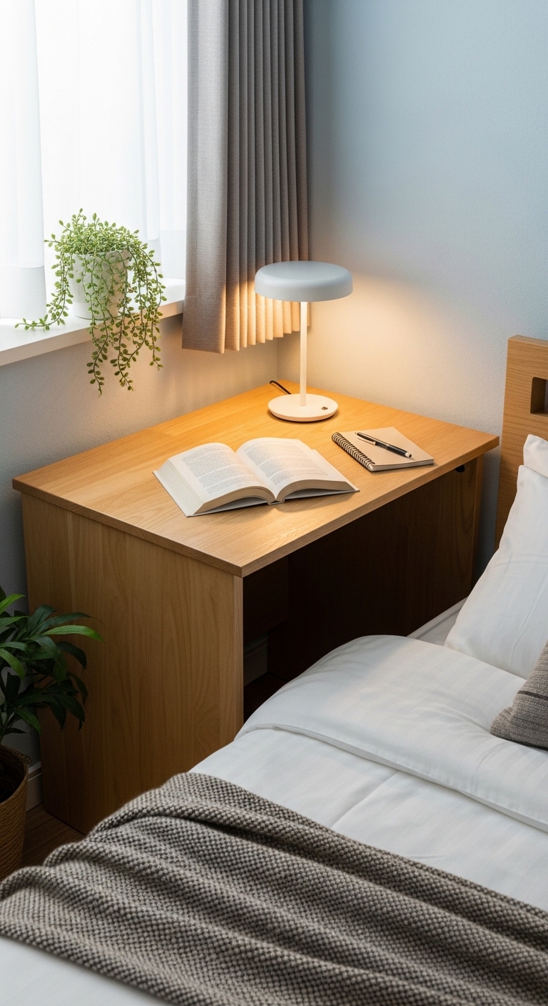 Keep the desk surface simple — a lamp, a small plant, your current book, and a charging dock is all you need. During the day, your laptop opens up and it becomes a proper desk. At night, everything shifts aside and it becomes your nightstand.