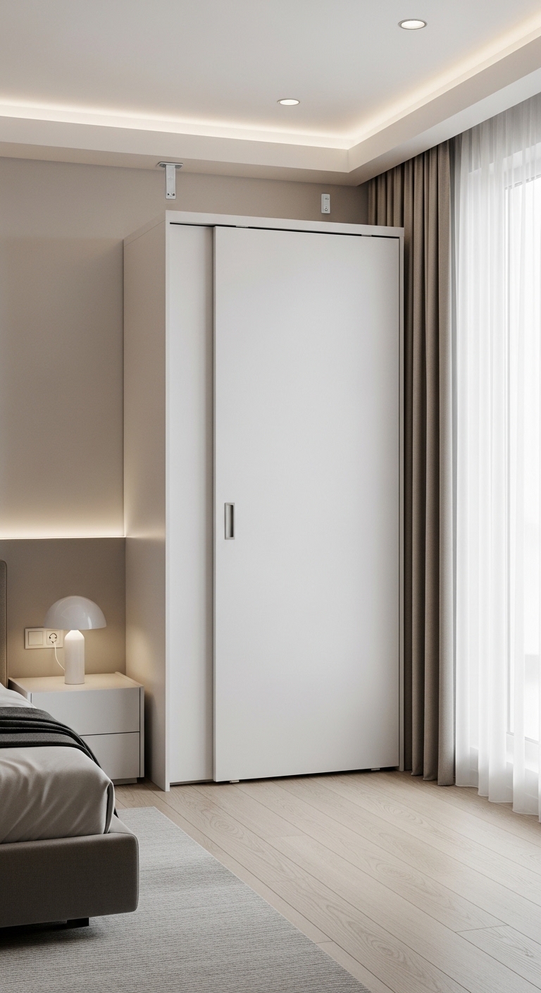 A traditional hinged door needs clearance space to swing open — typically a full door’s width of floor space that you can never use for furniture or anything else. In a small bedroom, that’s a significant chunk of real estate essentially wasted.