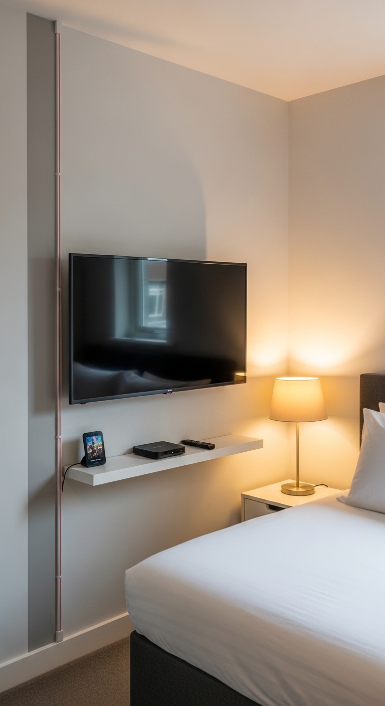 Clean cable management — either routing cables inside the wall or using a slim cable channel along the wall surface — keeps the whole setup looking polished rather than improvised.