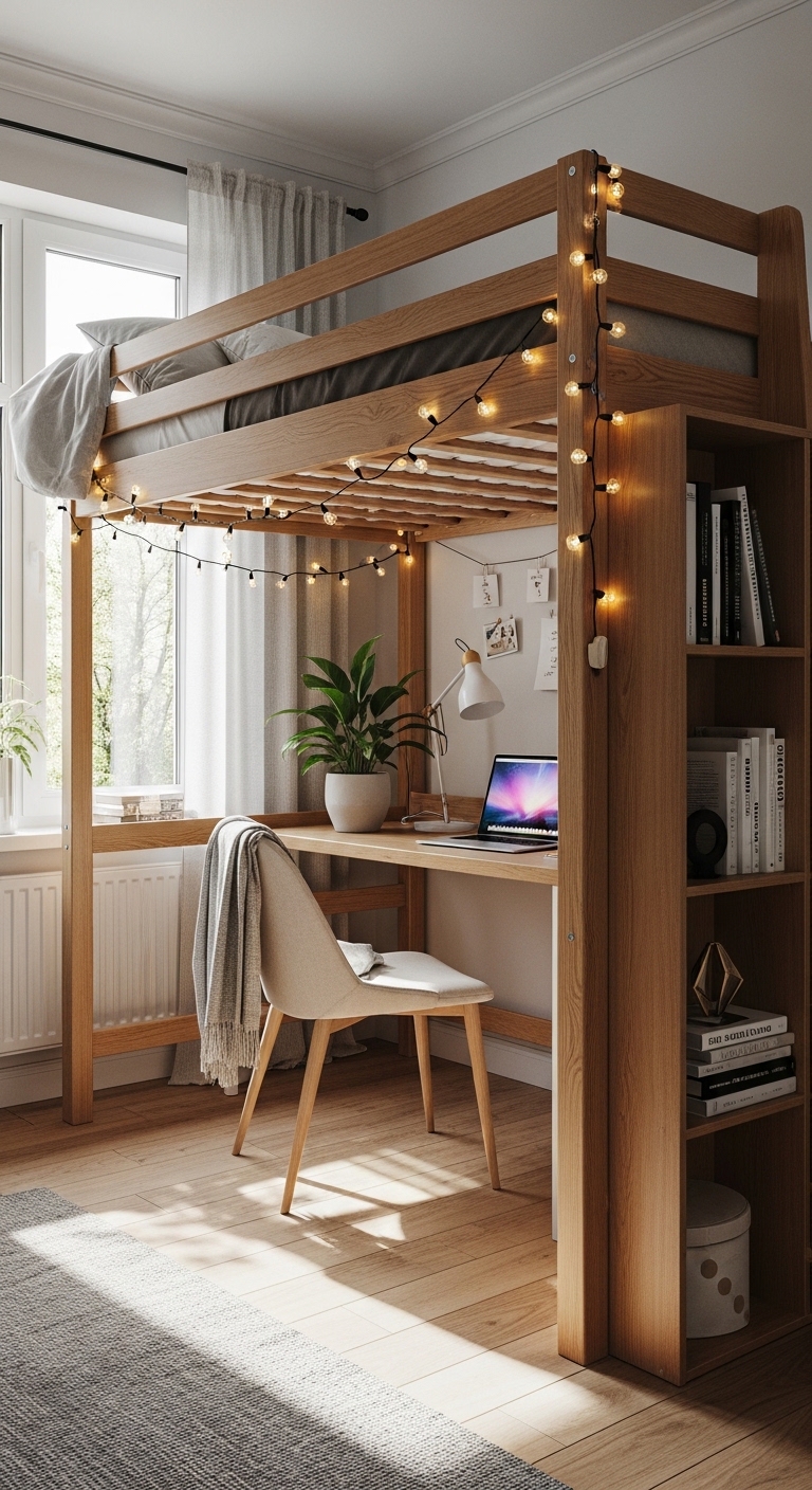 This is one of the most dramatic changes you can make in a small bedroom. A lofted bed lifts your sleeping area completely off the floor, which instantly frees up an entire zone beneath it. That space can become a study nook, a mini closet, a cozy reading corner, or even a small sofa area.