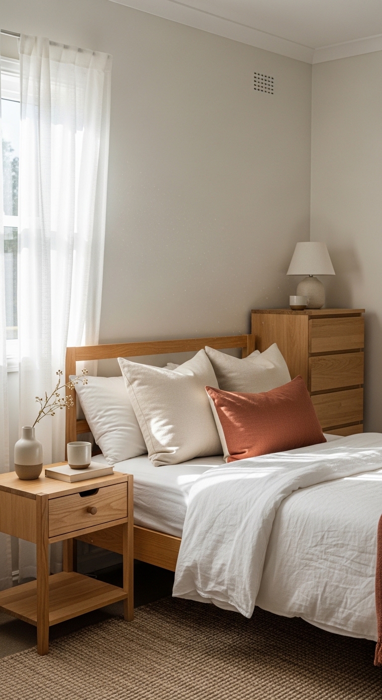 This small change makes your bedroom look intentionally designed rather than just furnished — and that’s a big deal in a tight space.