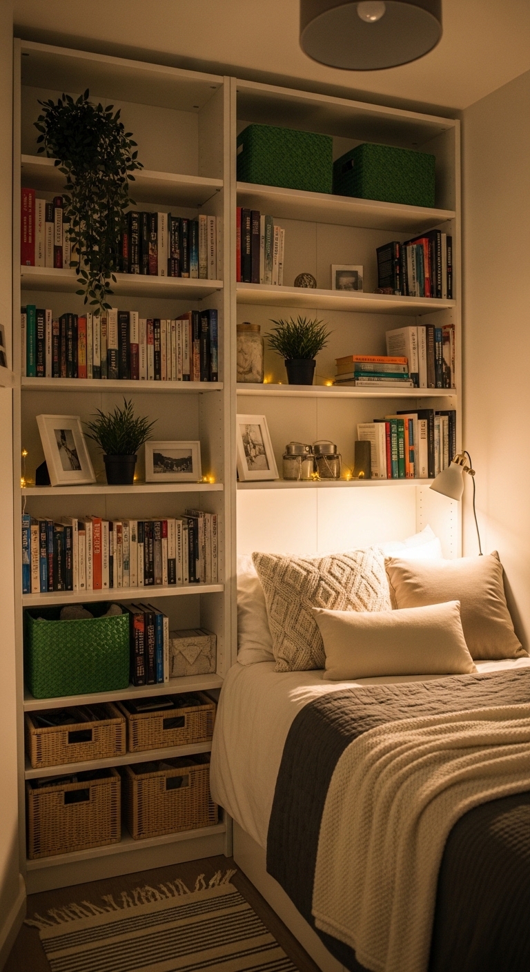 When floor space is limited, the only direction left is up. Tall vertical shelving draws the eye upward, which makes your ceiling feel higher and your room feel larger. It also gives you serious storage and display space without touching the floor plan.