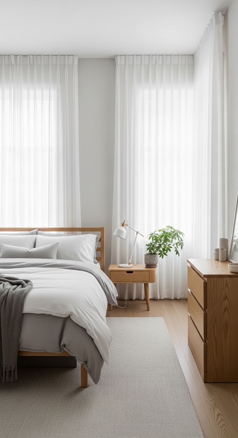 Stick with light, sheer fabrics for small bedrooms. Heavy blackout curtains can still work — just make sure the color stays light and the hang stays high.