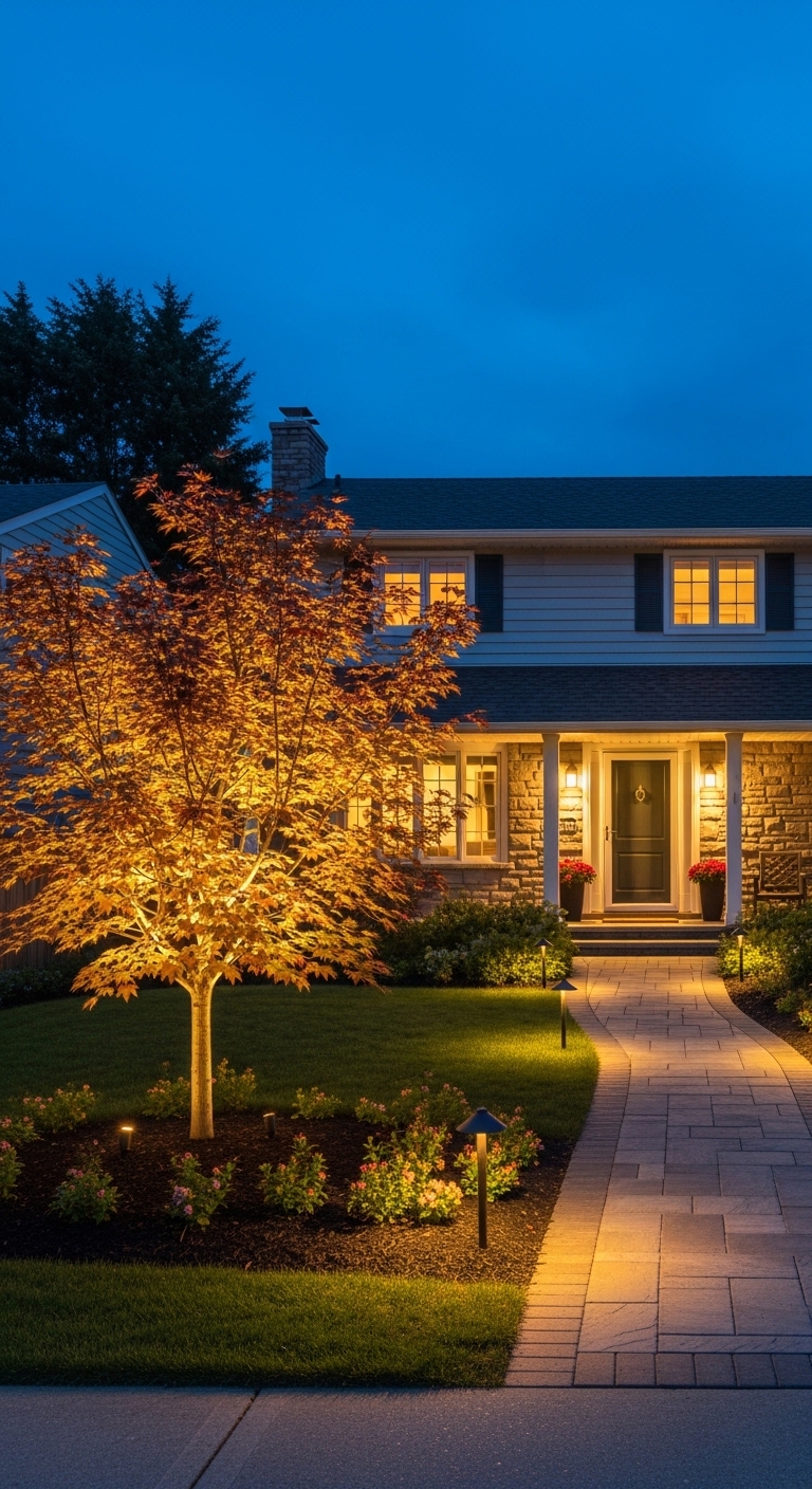 Use uplights to highlight your statement tree, path lights along your walkway, and a focused spotlight on your front door. Layer warm white lights rather than cool blue tones — warm light feels welcoming, cool light feels clinical.