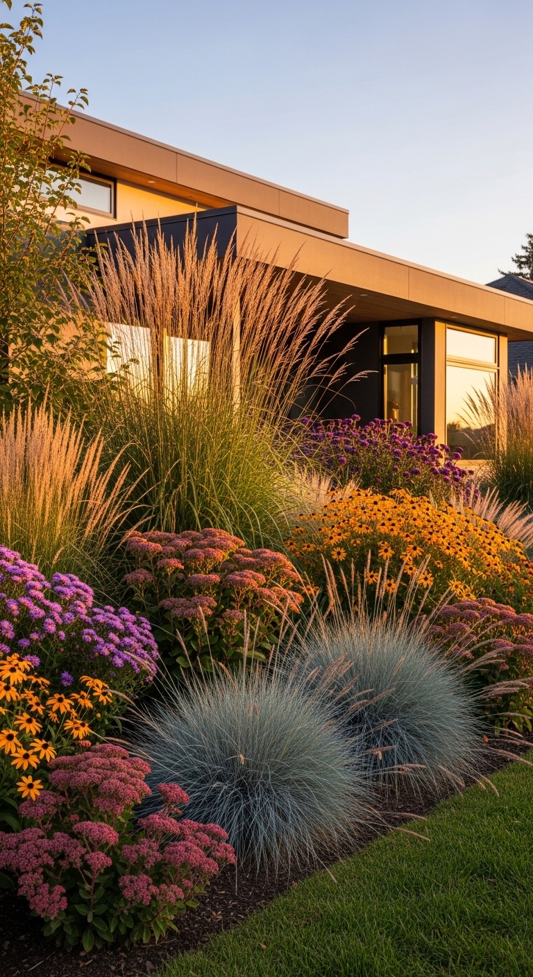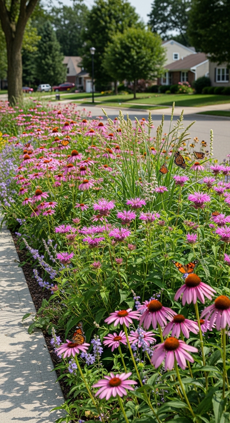 Plant native wildflowers like coneflowers, wild bergamot, and prairie dropseed grass. These plants evolved in your region, so they need almost no supplemental water or care once established. They’ll attract pollinators by the hundreds and give your front yard a relaxed, naturalistic beauty that stands out in a neighborhood full of plain grass strips.