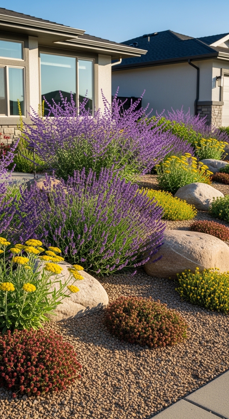 Combine drought-tolerant plants like Russian sage, yarrow, sedum, and lavender with mulch, gravel, and strategically placed boulders. The result looks anything but dry or sparse — a well-executed xeriscape is lush, textural, and endlessly interesting. And once established, your water usage drops dramatically.