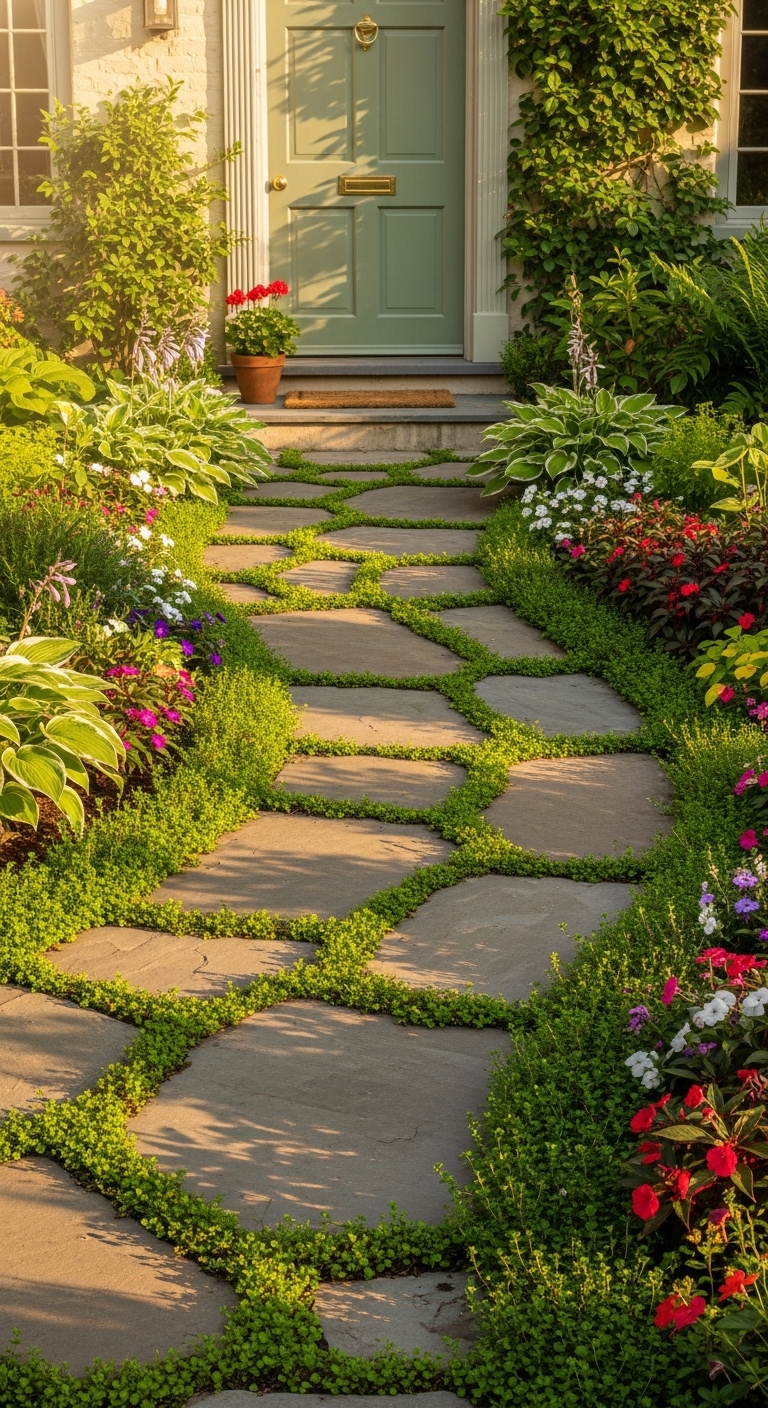 Use irregular flagstone, bluestone, or even reclaimed brick for a relaxed, organic feel. Space the stones slightly apart and fill the gaps with creeping thyme or moss — both are low-maintenance and add incredible texture. For a more polished look, go with uniform pavers set in a straight or gently curved line.