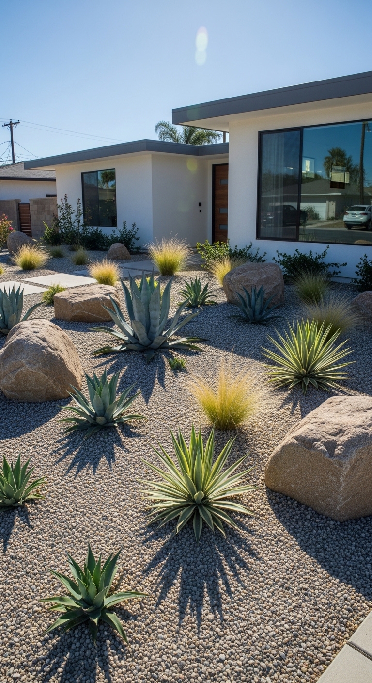 Use decomposed granite or river rock as your base, then add drought-tolerant plants like agave, lavender, ornamental grasses, and yucca throughout. Add a few larger boulders for structure, and you’ve got a yard that looks designed, not abandoned.