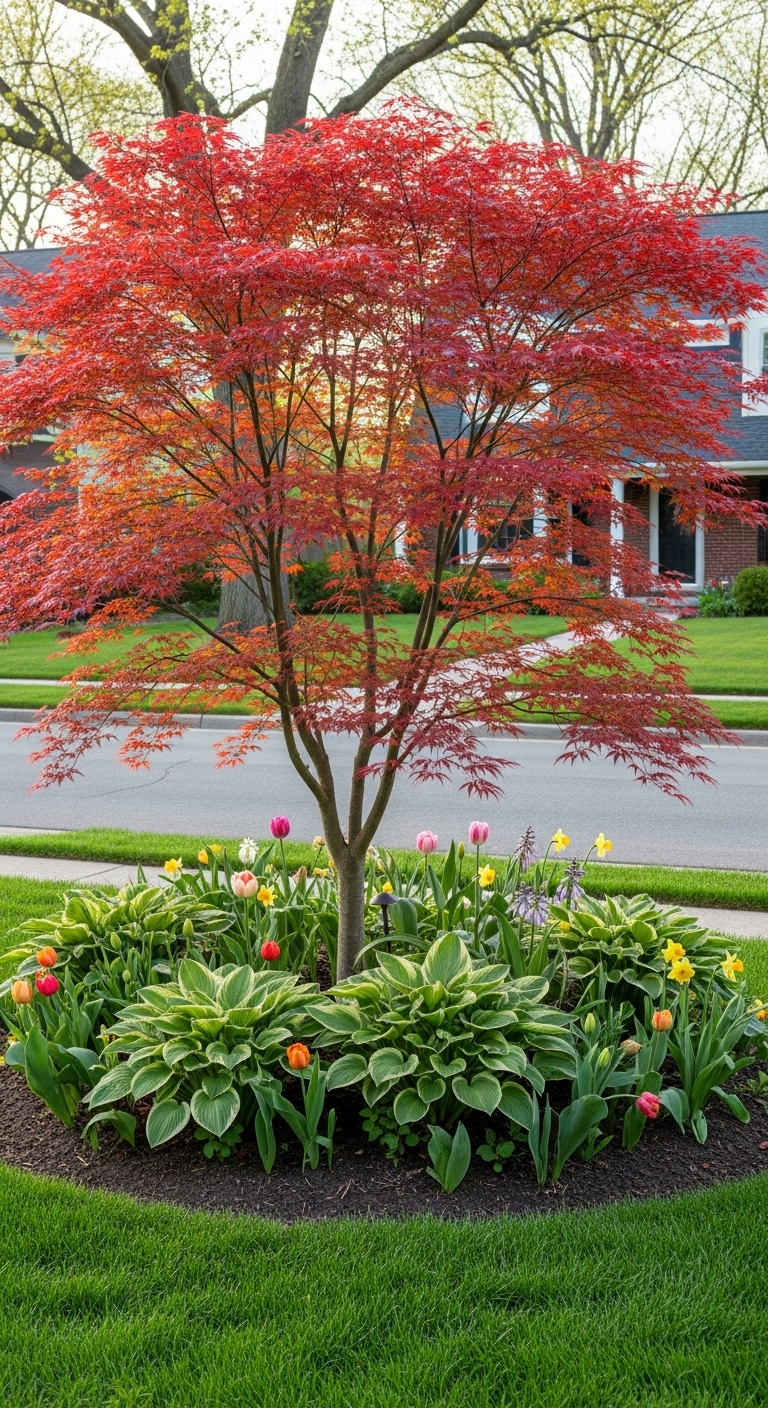 Place your statement tree slightly off-center in the yard rather than dead-center. This creates a more dynamic composition. Underplant it with a ring of hostas, pachysandra, or seasonal bulbs to complete the look.