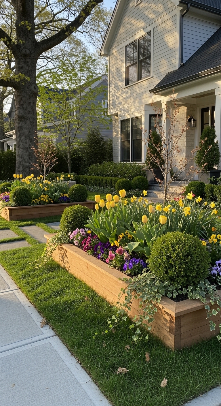Use cedar or composite raised beds along your home’s front wall and fill them with a mix of evergreen shrubs, seasonal flowers, and trailing plants. The evergreens give you year-round structure, and the seasonal plants let you refresh the look every few months without much effort.