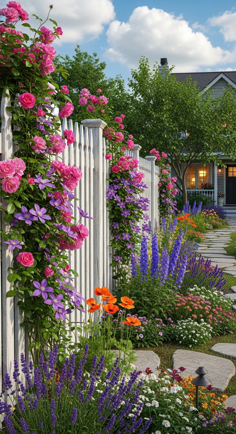 Choose a fence height that’s welcoming rather than imposing — around three feet works beautifully for front yards. Train climbing roses or wisteria along the top rail. Within two seasons, you’ll have a front yard that looks like it belongs in a magazine.