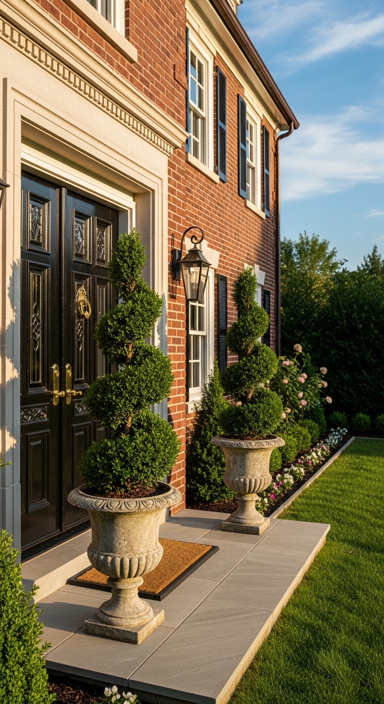 Symmetry is one of those design principles that works every single time. When you frame your front door with matching elements — twin boxwood topiaries, a pair of urns, identical lanterns — the whole entrance feels intentional and polished.