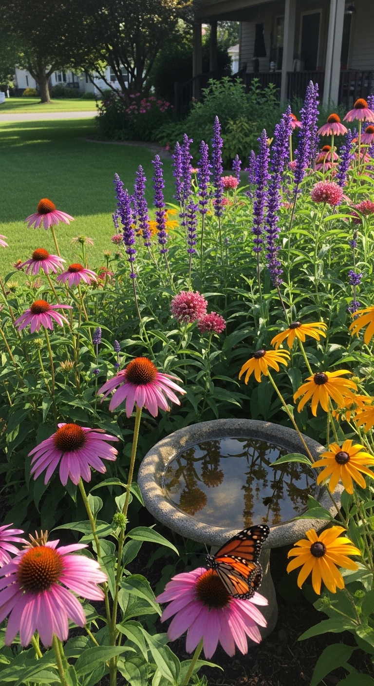 Plant milkweed for monarchs, coneflowers for bees, and salvia for hummingbirds. Add a shallow birdbath or small water dish, and you’ve created a mini ecosystem right outside your door. Neighbors and passersby will stop and watch — guaranteed.